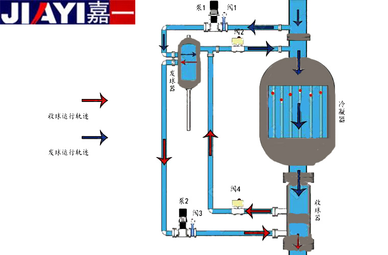 發球機將膠球發入冷凝器中,膠球依靠水壓差擦洗掉換熱管內壁的污垢,在冷卻水出口端通過捕球器回收膠球至發球機形成一個清洗循環,通過微電腦控制程序設置清洗頻率和次數,達到自動在線清洗功能。始終保持冷凝器內壁潔凈,換熱效率最高,冷水機組制冷效率最高,降低能耗,節省能源。提高冷水機組制冷效率、節能率6%-15%。
